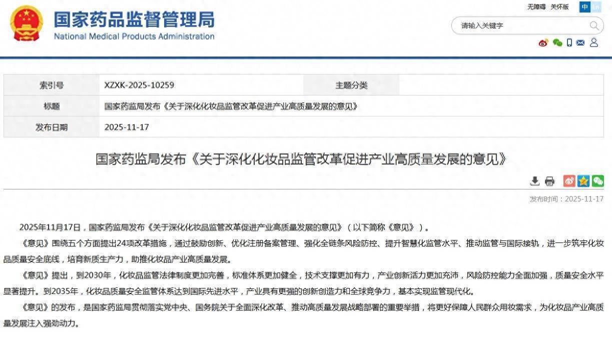 2025年11月17日,国家药监局官网发布《关于深化化妆品监管改革促进产业高质量发展的意见》(以下简称《意见》)。
